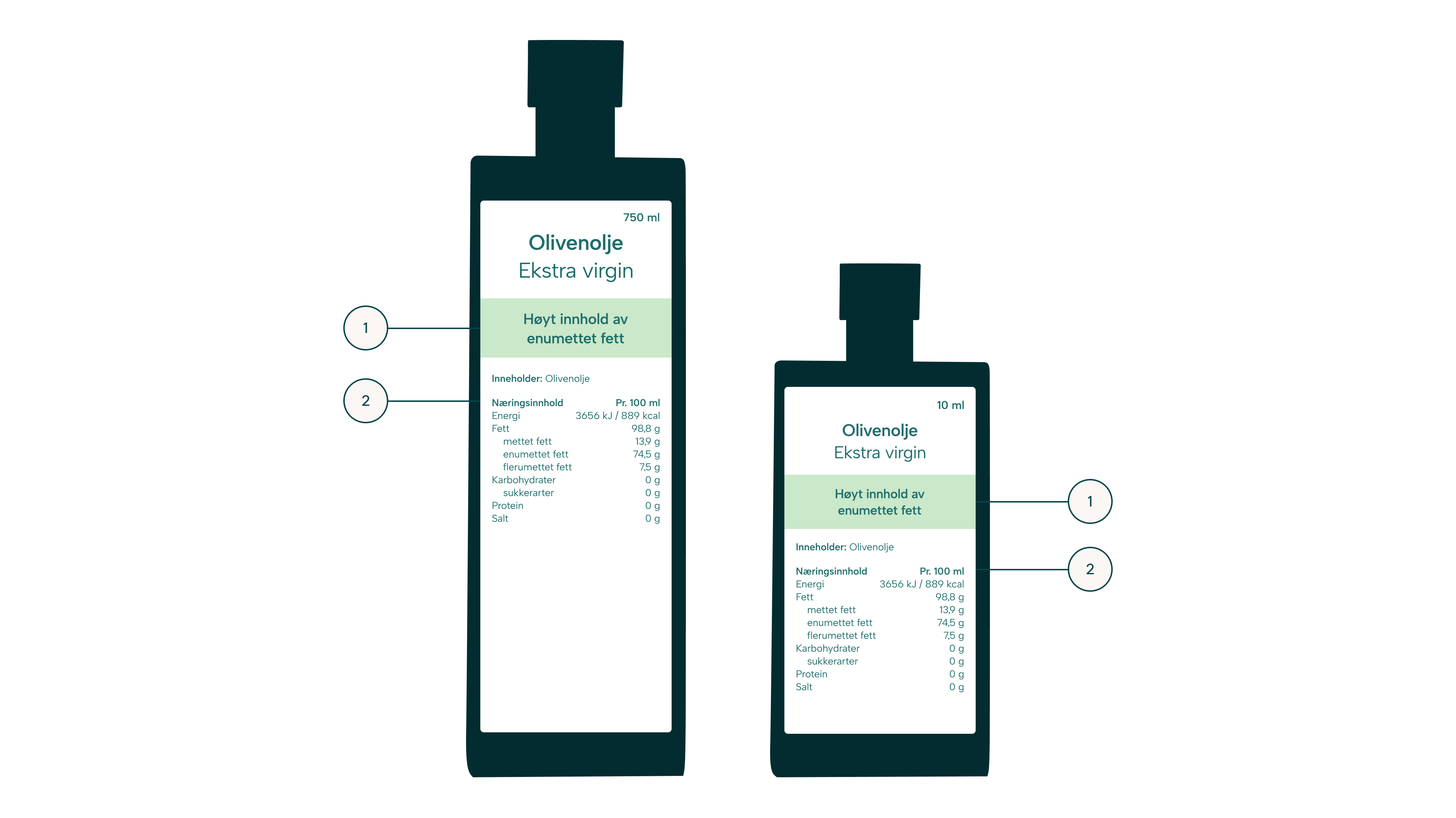Det er obligatorisk å deklarere innholdet av et stoff når dere bruker en påstand om stoffet. Mengden av stoffet skal oppgis i samme synsfelt som næringsdeklarasjonen, men ikke i selve næringsdeklarasjonen hvis stoffet er et annet stoff enn de som omfattes av reglene for næringsdeklarasjon i matinformasjonsforordningens artikkel 30 nr. 1 eller 30 nr. 2. I bruksbetingelsene for den helsepåstanden som brukes i dette eksempelet står det spesifisert at produktet må inneholde «minst 5 mg hydroksytyrosol og derivater av dette (for eksempel oleuropein-kompleks og tyrosol) pr. 20 g olivenolje».