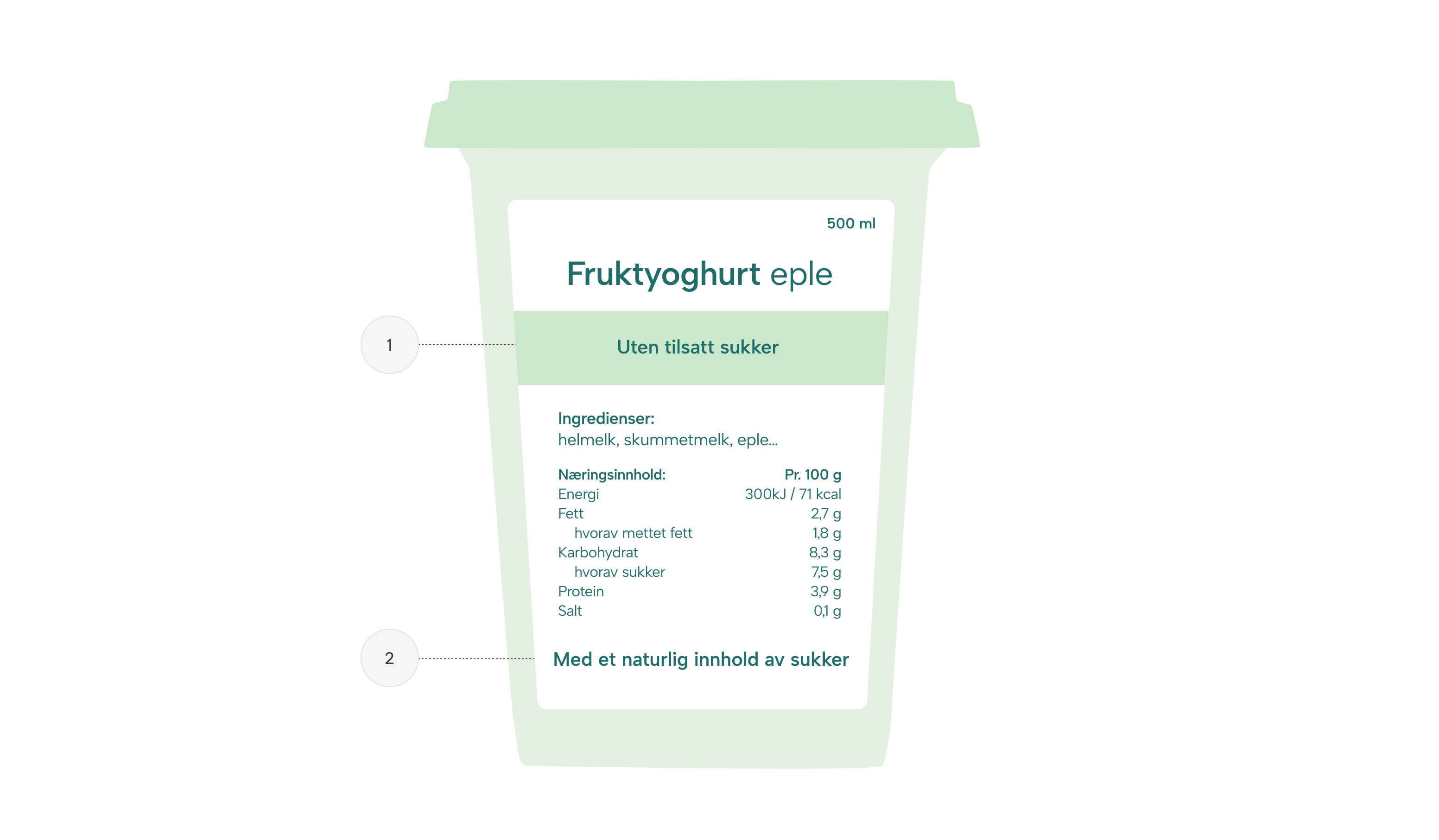 Når dere bruker påstanden «uten tilsatt sukker», bør dere, dersom produktet har et naturlig innhold av sukker, også gi følgende opplysning på etiketten: «med et naturlig innhold av sukker». Se eksempel under.